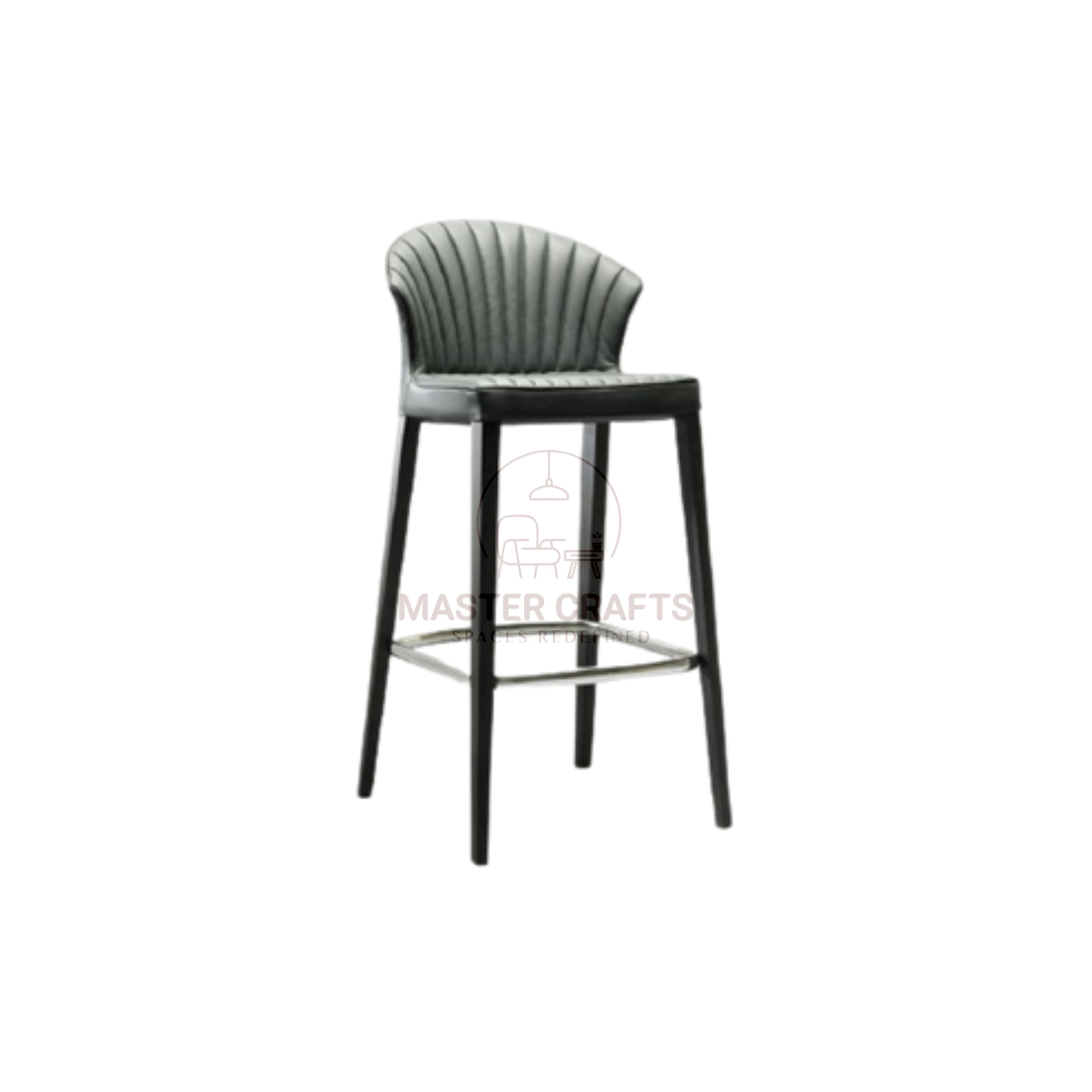This sleek bar stool is a statement piece with an Art Deco flair. The standout feature is the shell-like curved backrest, which is vertically ribbed or channel-tufted in a textured gray upholstery. The seat is a contrasting smooth, black leather or leatherette. The base is constructed from four simple, straight, black-finished wooden legs that taper slightly toward the floor. A slim, polished chrome or silver-toned metal footrest ring adds a touch of brightness and functionality to the dark frame.
