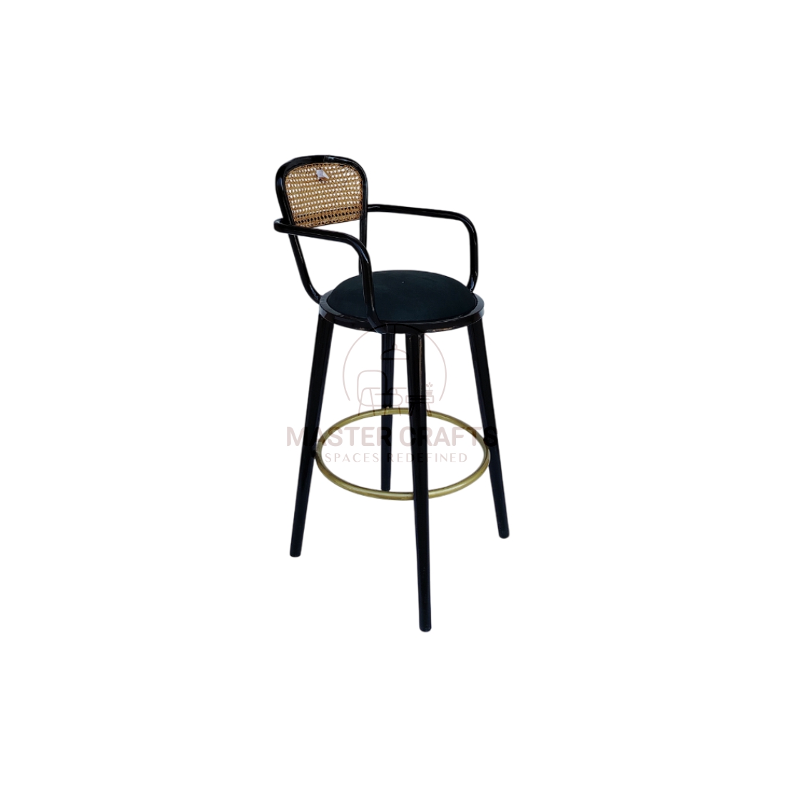 The seat is a simple, rounded design, upholstered in a dark, perhaps black, material for seamless integration with the frame. The most striking detail is the small, rounded backrest, which is framed in black and prominently features a panel of natural cane or rattan webbing. This light, natural texture provides a beautiful contrast to the dark wood and adds a touch of Bohemian or coastal modern flair.