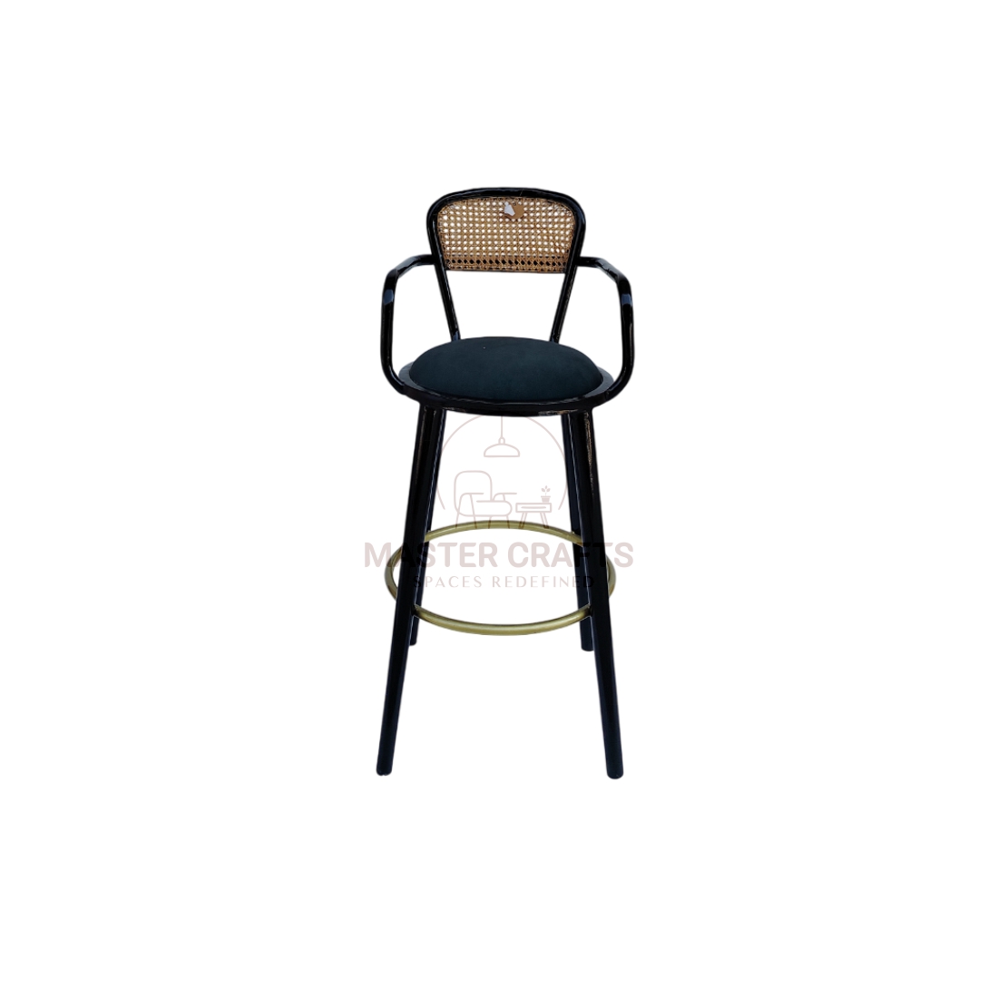 This sophisticated bar stool masterfully blends classic bistro style with modern finishes and materials. The chair features an entirely black-stained solid wood frame, giving it a sleek, contemporary look that is both versatile and chic. The legs are gently tapered, providing a clean silhouette.