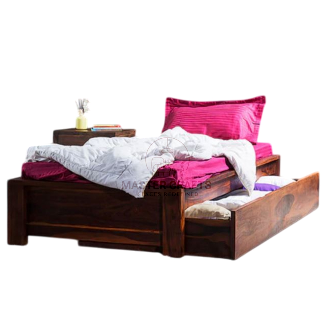 Built with heavy, solid wood for maximum durability, this single bed features a low, wide frame with a significant presence. The frame conceals a large, low pull-out unit that can be utilized as either an extra-large storage drawer or an emergency trundle bed. Its simple, unadorned headboard and footboard emphasize the rich wood grain, making it a rugged and practical choice for any room needing multi-functional furniture.