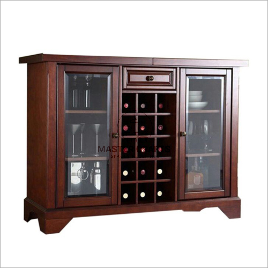 This sophisticated wine bar cabinet is an essential piece for any entertainer. Finished in a rich mahogany or cherry tone, it exudes traditional elegance. The centerpiece features a dedicated 12-bottle wine rack for secure storage of your collection, topped by a single utility drawer for corkscrews and accessories. Flanking the rack are two spacious cabinets with framed glass doors, allowing you to proudly display your stemware, decanters, and bar tools. The cabinet’s sturdy base and classic molding details make it a distinguished addition to a dining room, living area, or dedicated home bar. This unit seamlessly combines display, storage, and style.