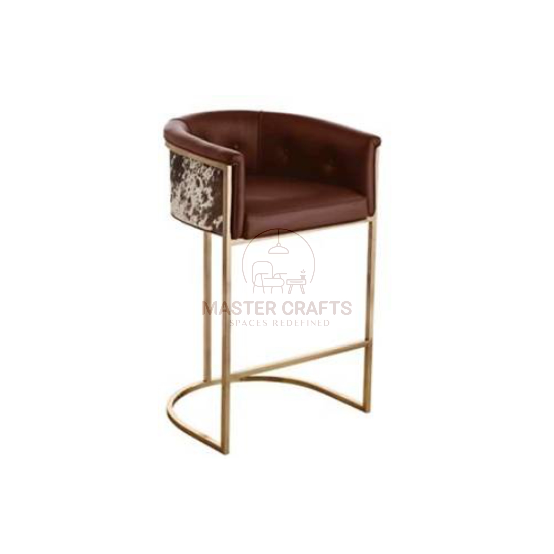 This stool, likely a Counter Stool due to its proportions, is a piece of art that seamlessly merges natural textures with modern geometry. The base is an eye-catching A-frame or arched metal structure finished in a luxurious brass or gold tone. The seat is a unique composition: a curved, tufted leather back/side panel in a rich, warm brown provides enveloping support, while the seat cushion (partially visible) appears to feature a dramatic, patterned hair-on-hide or distressed leather insert.
