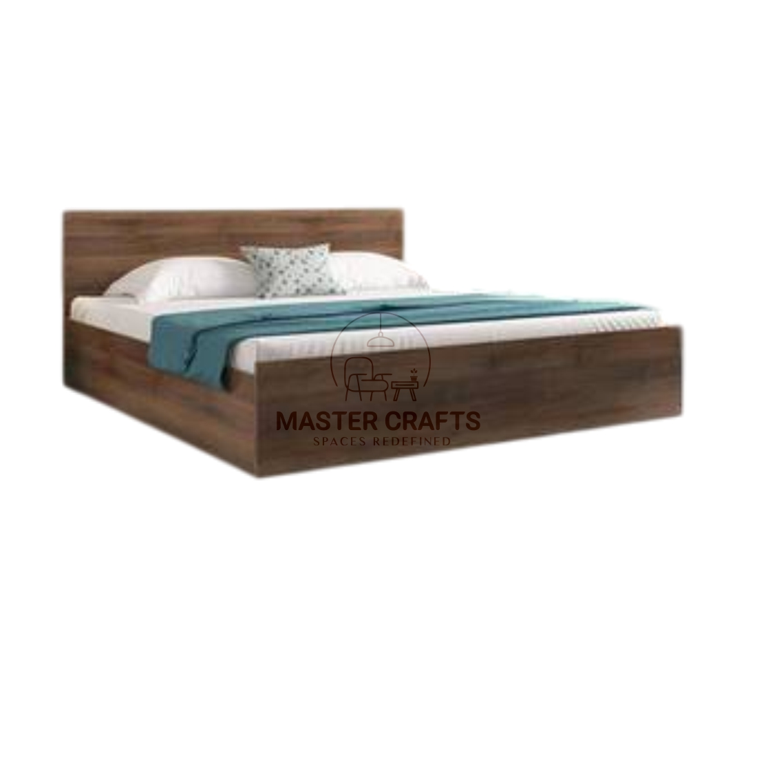 An exercise in modern simplicity, this queen bed features a clean, low-profile platform design with a warm wood finish. The look is streamlined and uncluttered, with a simple, solid rectangular headboard that blends seamlessly with the base. The full-box frame suggests integrated storage space beneath the mattress, offering a practical solution for urban living or minimalists. Its smooth veneer and lack of ornamentation make it highly adaptable to various modern and transitional décor styles.