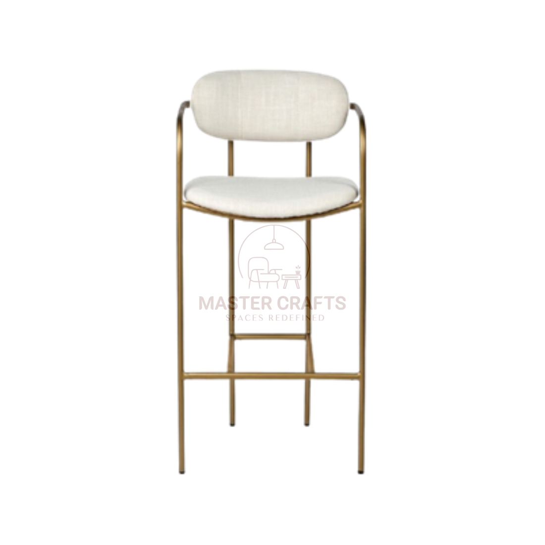 This bar stool blends modern elegance with a comfortable, supportive design. The entire frame is rendered in slender metal tubing with a rich brushed gold or brass finish. The key feature is the cradle-style frame, where the continuous metal tubing forms both the legs and the low, subtle armrests that flow up to support the backrest. The seat and the slightly curved back are generously padded and upholstered in a light cream or off-white textured fabric, offering a soft, bright contrast to the metal.