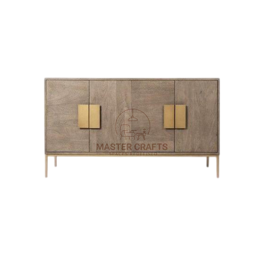 This ultra-chic buffet cabinet is a testament to modern Scandinavian and minimalist design. The body is finished in a beautiful light, neutral wood tone with a visible grain that keeps the look soft and natural. The true design focal points are the two oversized, striking gold-toned square panel handles, which offer a dramatic contrast to the pale wood. The piece is lifted on thin, tapered gold metal legs, enhancing its airy, contemporary feel. With four doors providing expansive, concealed storage, this sideboard is ideal for adding both high-fashion style and functionality to your dining or living room.