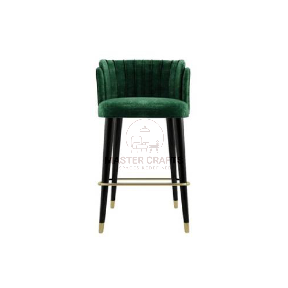 This luxurious bar stool is a statement piece, blending Mid-Century Modern comfort with a dramatic glam aesthetic. The seat and enveloping, low backrest are fully upholstered in a deep forest green velvet. The back is the focal point, featuring striking vertical channel tufting (or fluting) that provides texture and a nod to classic design. The stool stands on four tapered legs finished in a contrasting matte black. The elegant design is completed by a polished brass or gold footrest ring and matching gold ferrules (metal caps) on the feet, offering a sophisticated contrast and protecting the leg ends. This stool is ideal for upscale bars or stylish kitchen islands.