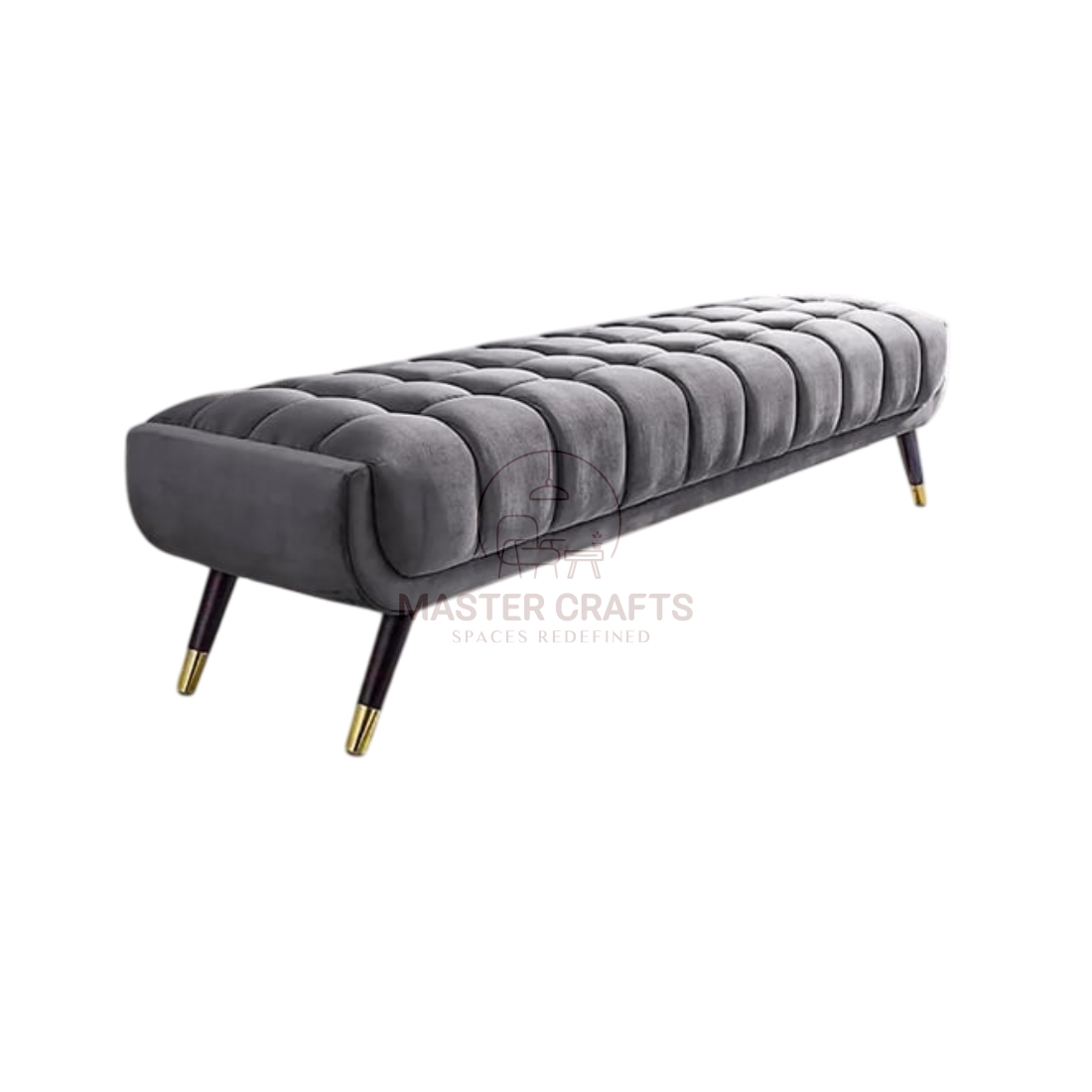 Designed with both style and function in mind, the Mid-Century Modern Bedside Bench features a simple, clean-lined design. Its charcoal grey upholstered top provides a subtle contrast to the warm, angled wooden legs, characteristic of the mid-century aesthetic. Perfectly proportioned to complement a bed, as seen in the image, it offers a practical surface for essentials or a comfortable spot for getting ready.