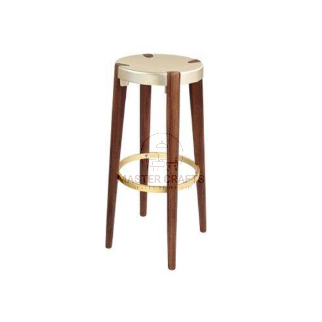 Combining different textures and materials, this stool evokes a Mid-Century Modern sensibility. It features a sturdy seat top made from a light-colored metal or composite material with inlaid dark accents, secured to four dark-stained, tapered wooden legs. A highly polished brass or gold-tone ring acts as a circular footrest, connecting the legs and providing excellent stability. The contrast between the warm wood, the cool metal seat, and the bright brass ring makes this a sophisticated and elegant choice for upscale bars, offices, or residential spaces.