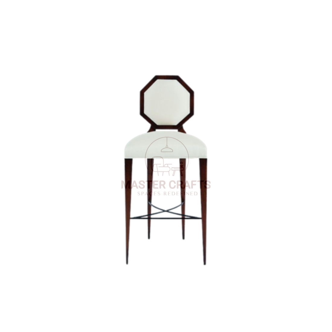 This stool presents a clean, Mid-Century Modern aesthetic, likely serving as a Counter Stool. It contrasts warm wood with a crisp white seat. The frame features tapered legs in a dark, rich wood finish (like walnut or mahogany), characteristic of the era, reinforced by subtle metal cross-bracing. The seat is an oval or pill-shaped cushion upholstered in a clean white or light cream fabric/leather.