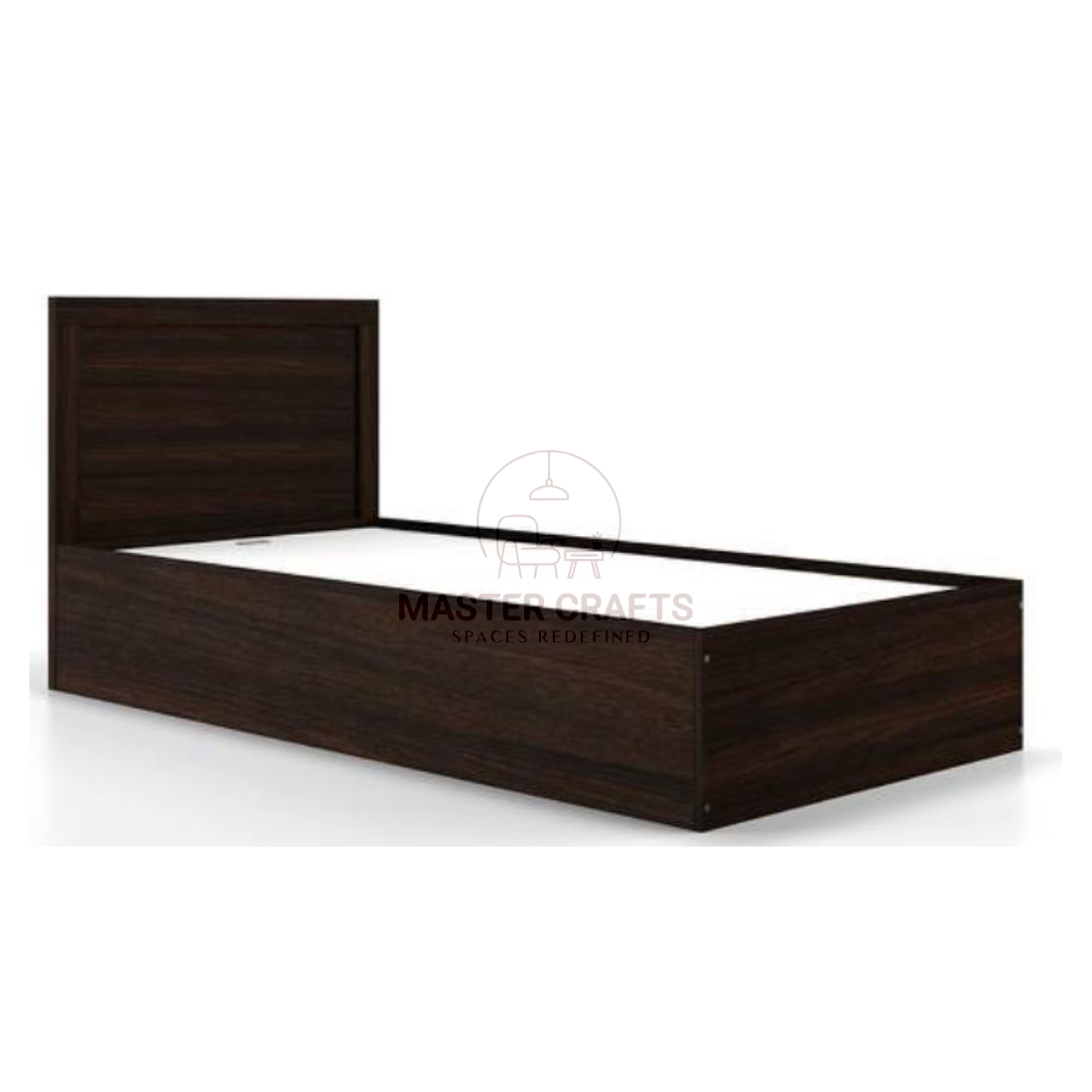 This bed epitomizes minimalist, space-saving design with a sleek, contemporary aesthetic. Crafted in a dark, rich wood finish—possibly espresso or black walnut—it offers a sophisticated and clean look suitable for a small bedroom, guest room, or college dorm. The single-size frame features a simple, unadorned headboard that is low-profile and rectangular, seamlessly integrating with the overall box design.