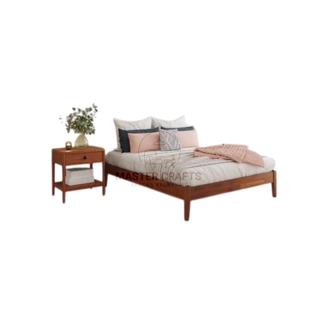 This bed represents the essence of Mid-Century Modern design: simple, elegant, and functional. It features a straightforward, warm-toned wood frame with clean lines. The bed’s defining characteristic is the subtle elevation on flared, tapered legs, giving it a lighter, more graceful profile. The design omits a pronounced headboard for a minimal aesthetic, focusing instead on the beautiful wood finish and classic silhouette. It is ideal for smaller rooms or for those who prefer an understated, vintage-inspired look.