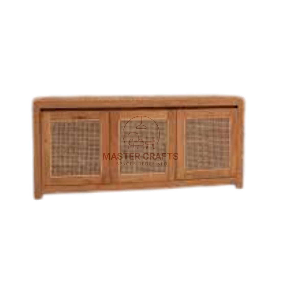 A minimalist take on the cane trend, this media console features clean lines and a simple, rectangular form. The body is constructed from a warm, medium-toned natural wood, providing a neutral yet inviting foundation. The front is composed of three cabinet doors, each panelled with light, woven cane webbing. This piece is long and low, making it ideal as a stylish base for a television or a simple, chic sideboard in a dining room. The breathable nature of the rattan doors makes it particularly suitable for organizing and ventilating media components and gaming consoles.