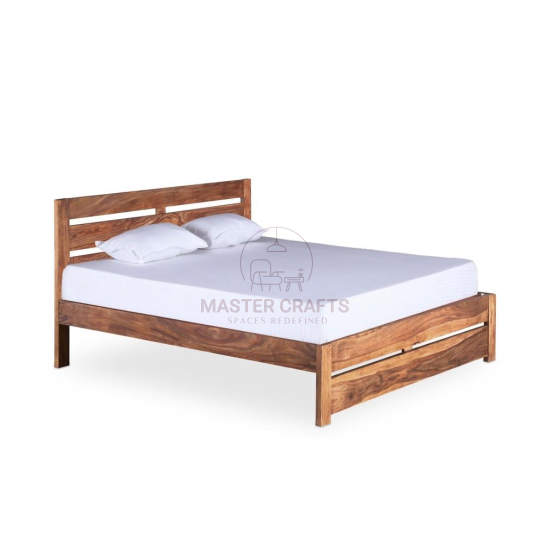 Perfect for a modern or minimalist space, this queen bed features a clean, low-profile frame crafted from light-toned, beautifully grained wood. The headboard is defined by two prominent horizontal slats that maintain an open, unheavy aesthetic. The bed’s simple geometry, exposed wood grain, and low stance emphasize the contemporary desire for uncluttered and natural design. It provides strong visual appeal without dominating the room.