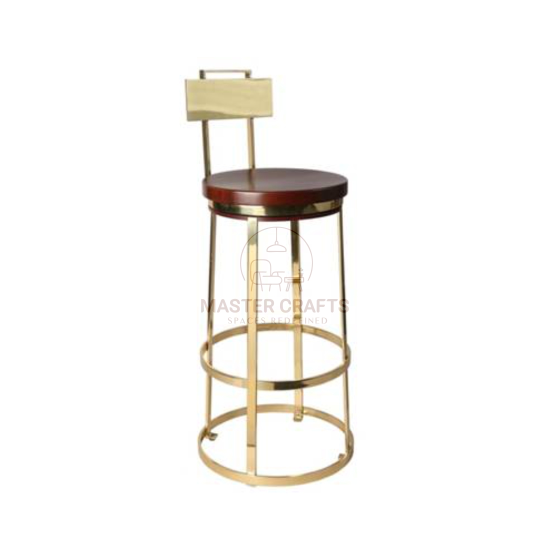 This stylish Bar Stool is a statement piece, blending industrial appeal with polished luxury. The frame features a robust structure crafted from sleek, polished brass or gold-finished metal, including dual circular footrests for comfort and stability. The seat is a classic round top made of rich, dark-stained wood (like mahogany or walnut), contrasting beautifully with the bright metal. A unique feature is the low, rectangular backrest finished in the same polished brass, offering minimal but stylish support