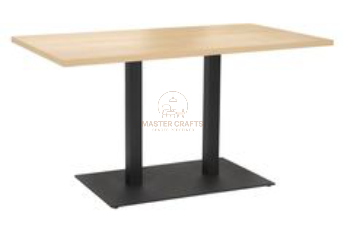 This Modern Commercial Twin Pedestal Dining Table is a highly practical and sturdy option for heavy-use environments. It features a spacious, rectangular light-wood tabletop with clean lines. The top is supported by two robust, black metal column pedestals that are secured to a single, wide, rectangular floor plate. This twin pedestal design maximizes legroom and provides superior stability across the length of the table, making it a reliable and efficient choice for busy restaurants, offices, or large family dining.