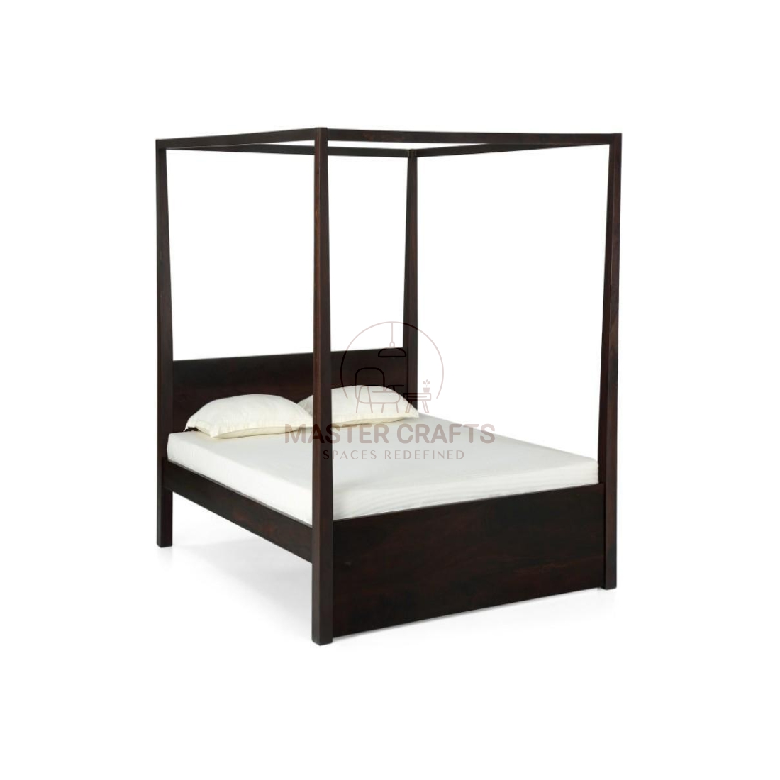 This is a contemporary interpretation of the canopy bed, focusing on bold, architectural simplicity. Crafted from dark-stained solid wood, it features a full box-style platform base and a simple, solid headboard. The four square posts extend upward to form a clean, uncluttered canopy frame. Its heavy base contrasts with the airy top structure, creating a modern, grounded, and dramatic aesthetic ideal for spacious bedrooms.