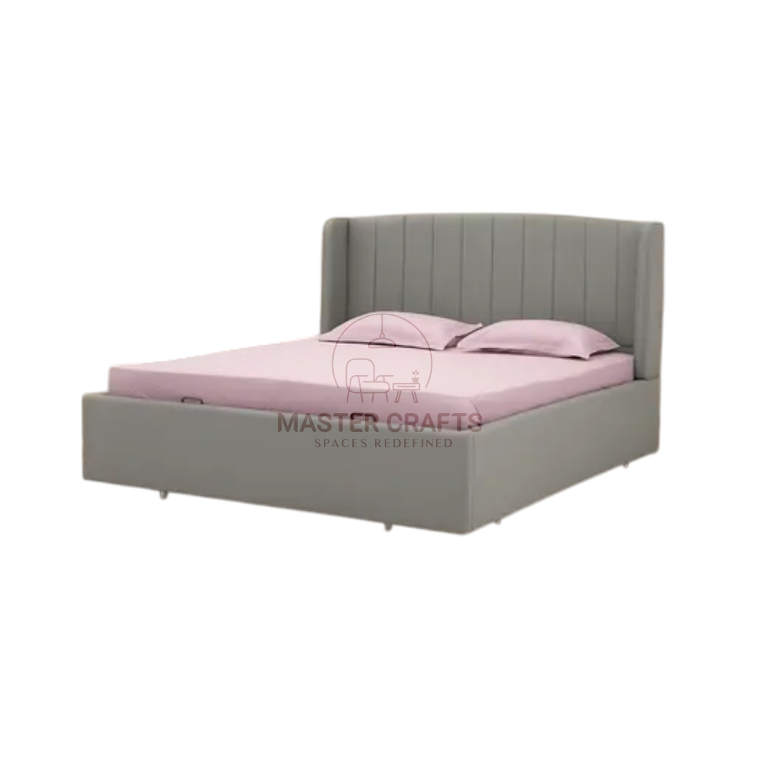 The image displays a sleek, modern upholstered platform bed entirely covered in a soft, light grey fabric. The design is characterized by its clean lines and minimalist aesthetic. The headboard is tall and features vertical channel tufting or panelling, which creates a streamlined and contemporary look, lending it a subtle architectural presence. The low profile of the side rails and footboard emphasizes its platform design, minimizing bulk. The bedding is a simple, light pink shade that contrasts softly with the grey upholstery. This bed is an excellent choice for a contemporary bedroom seeking a comfortable yet understated centerpiece that emphasizes texture and form over excessive ornamentation.