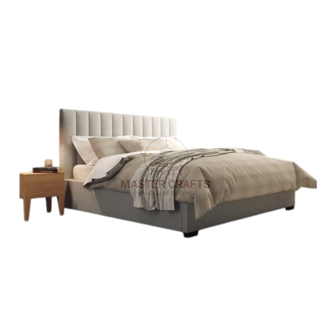 A chic and modern upholstered bed that focuses on texture and simplicity. The entire frame is wrapped in a neutral, light grey fabric, including the generously padded headboard. The headboard features prominent vertical channeling (or tufting) that creates strong, contemporary lines and provides a comfortable, supportive backrest. Supported by small, discreet feet, this bed has a clean, grounded appearance, making it perfect for a modern, minimalist, or transitional interior design scheme.