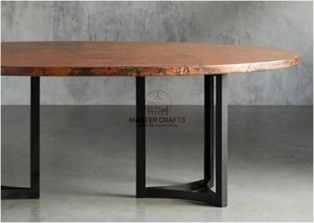 This Oval Copper-Top Trestle Table is a unique and handsome piece with a warm, metallic finish. It features a distinctive oval top that appears to be copper or a similar reddish-brown metallic surface with a subtle live edge detail. The top is supported by two sturdy black metal trestle bases composed of geometric, angled frames. The bold contrast between the rich, luminous top and the dark, industrial base creates a compelling, contemporary look, perfect for a high-end dining or conference space.