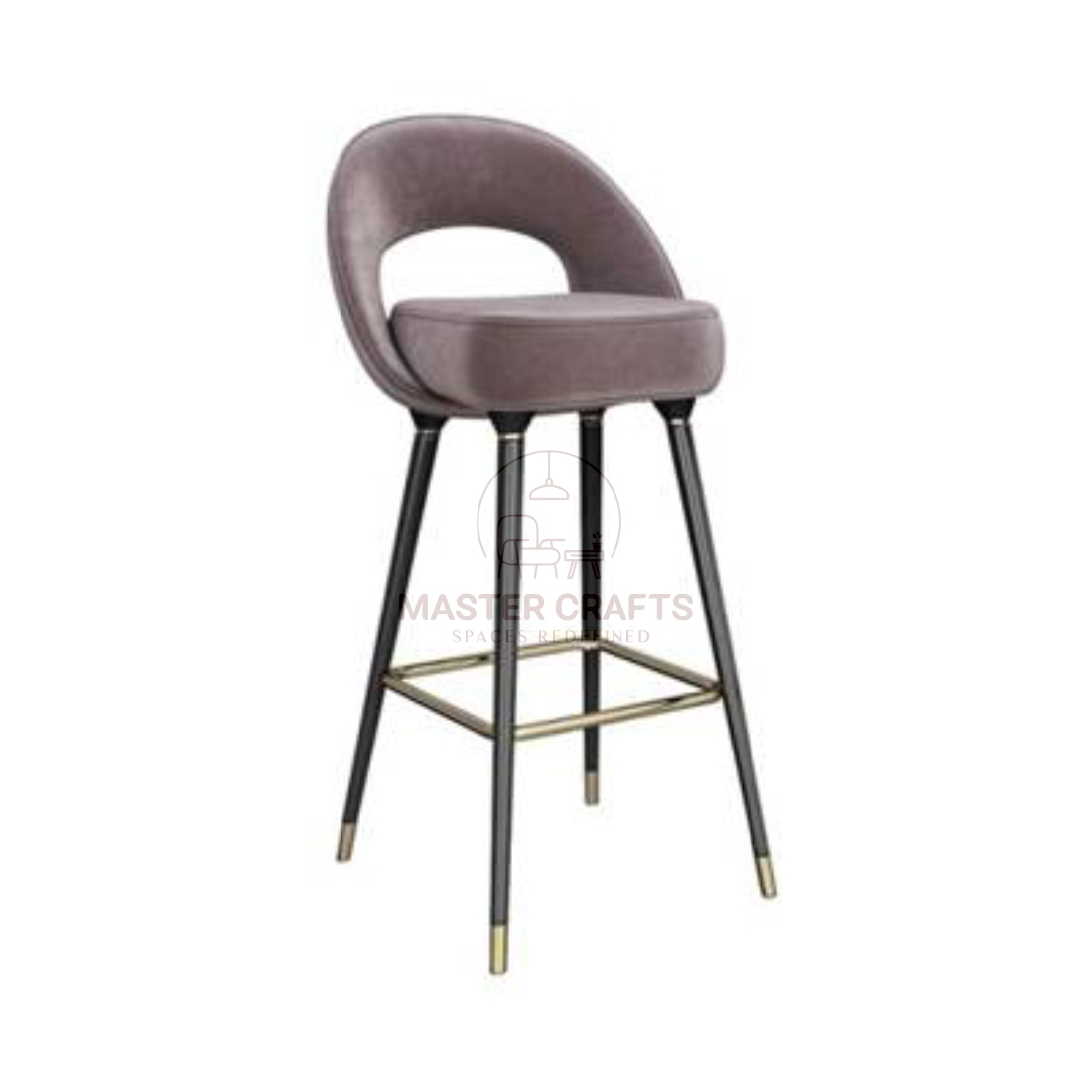 A truly striking piece of Contemporary Glamour, this bar stool features a unique, sculpted seat design. The plush, rounded seat and backrest are upholstered in a soft, luxurious mauve or dusty rose velvet. The back is characterized by a distinctive oval cutout, which adds a modern, airy feel while still providing lower back support. It rests on four dramatically tapered black metal legs, accented with elegant brass caps at the base. A coordinating brass footrest provides a comfortable brace.