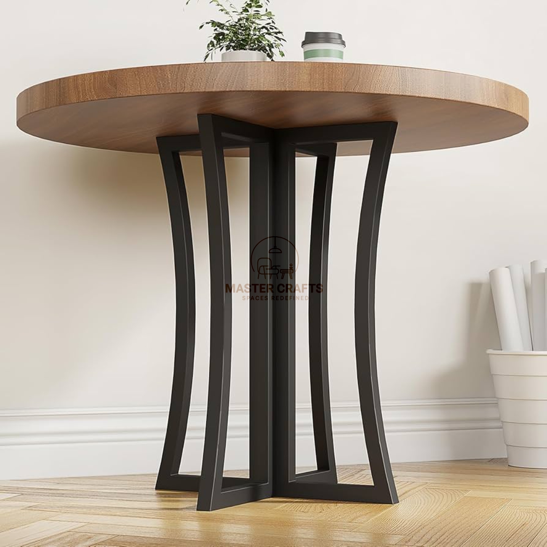 This Sculptural Round Dining Table is a centerpiece defined by its architectural base. It features a smooth, circular wood-tone top with a rich finish. The table is supported by a dynamic central pedestal base composed of multiple curved, vertical black metal struts. These struts flare outwards and then taper inwards, giving the base a visually arresting, hourglass-like shape. The design is modern, stable, and allows for maximum seating flexibility around the entire perimeter of the table, making it a striking addition to a contemporary dining room.