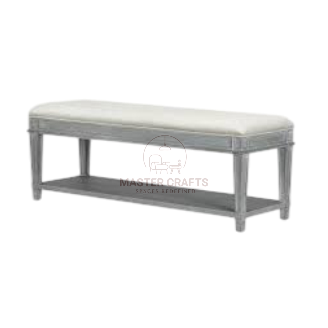 Evoking rustic elegance, the Chateau Bench boasts a distressed grey wooden frame with subtly carved details and a comfortable off-white upholstered top. Its design hints at classic French country style, offering a charming accent to any space. The integrated lower shelf provides practical storage for books, blankets, or decorative items, making it perfect for a cozy reading nook or a welcoming mudroom. This piece masterfully blends functionality with quaint, antique-inspired aesthetics, giving a warm, lived-in feel to your home.