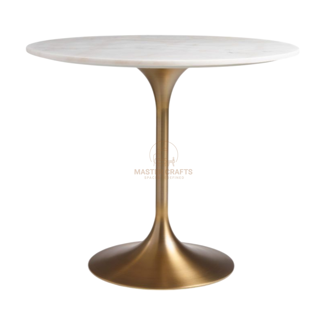 This iconic, elegant dining or accent table features a smooth, white marble or marble-look round top with subtle gray veining. It is supported by a single central pedestal base with a distinctive, smoothly flared “tulip” shape and a luxurious brushed gold or brass finish. The seamless design maximizes legroom and brings a Mid-Century Modern glamour to any space. It’s a sophisticated choice for high-end dining rooms, contemporary offices, or chic cocktail lounges.