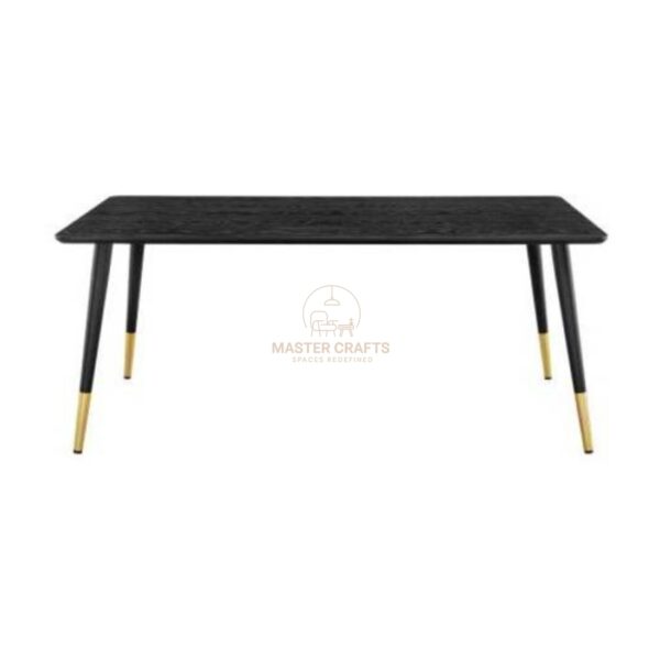 A striking blend of modern and glamorous design, this long rectangular table features a sleek, solid black top with subtly rounded corners, possibly a black marble-look or laminate. It stands on slender, angled legs that are black for the majority of their length, but feature polished gold or brass “dipped” feet. This two-tone leg design adds a sophisticated, Art Deco-inspired accent. It is an ideal statement piece for chic dining rooms, sophisticated restaurants, or luxurious conference settings.