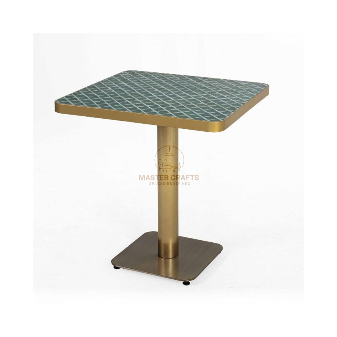 A glamorous small table featuring a square top with a distinct dark green and white grid pattern, bordered by a thin gold edge. The entire table base—including the cylindrical pedestal and the square foot—is finished in a luxurious brushed gold or brass tone. This design successfully blends classic bistro patterns with opulent materials, creating a striking aesthetic. It is perfect for upscale café corners, luxury retail displays, or high-end bar settings.