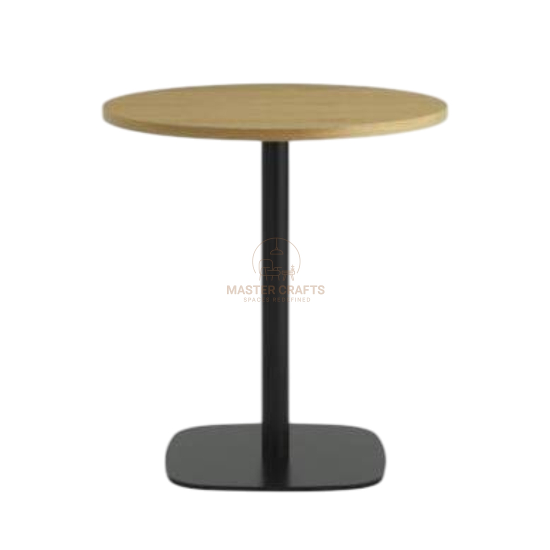 This compact, modern café table features a light blonde wood round top and a matte black central column. The unique element is the base: a softly rounded, almost rectangular “pillow” shape in matte black. This subtly curved base offers a gentler, more contemporary look than a harsh square or circle. The table is an excellent choice for environments seeking a clean, organic-modern feel with strong, practical stability.