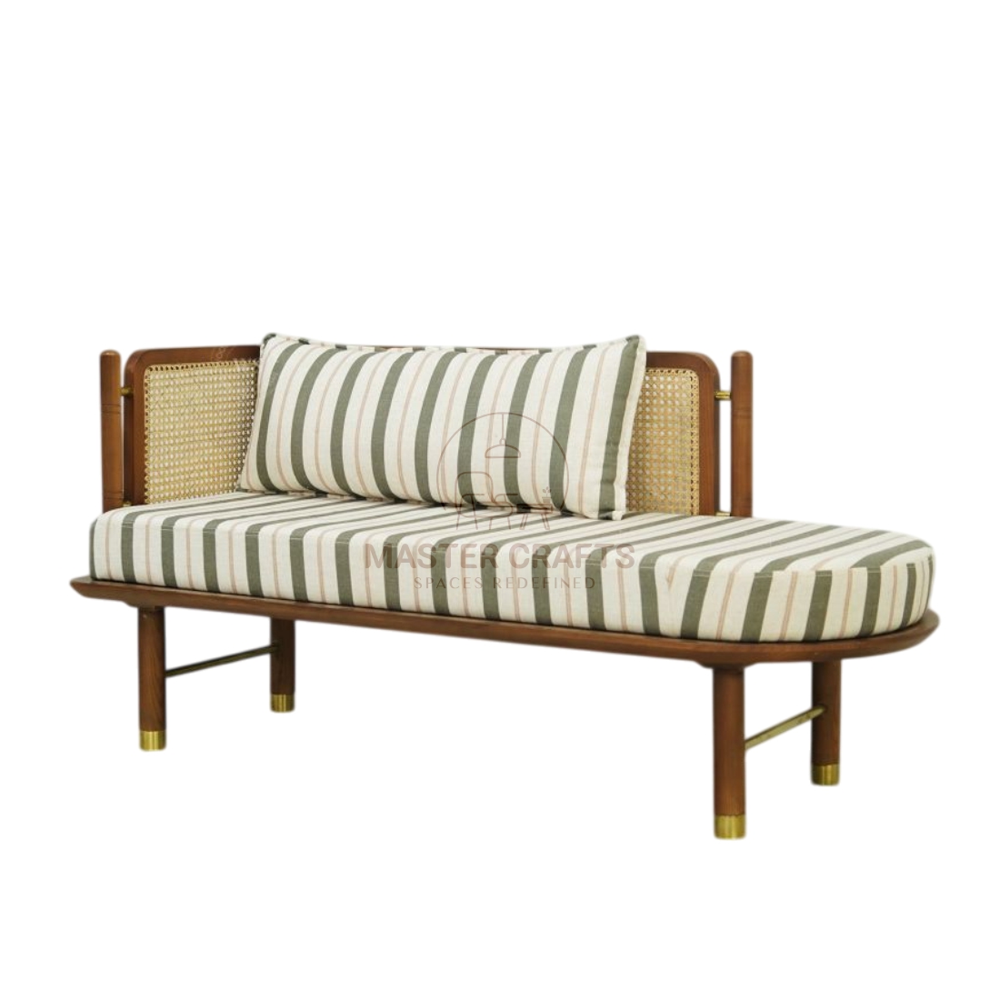 Embrace bohemian chic with the Rattan Retreat Chaise Bench. This distinctive piece features a warm wooden frame with natural rattan webbing on the backrest, complemented by a comfortable, striped upholstered cushion in calming green and white tones. Supported by delicate wooden legs with brass-capped feet, it offers a relaxed yet stylish seating option. Perfect for a sunroom, a breezy patio, or a eclectic living space, this chaise bench provides a touch of natural texture and comfortable lounging.