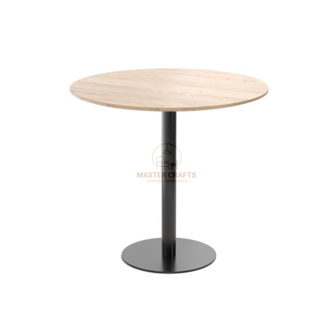 A clean and versatile dining or café table with a light-toned, natural wood or oak veneer round top. It is supported by a simple, matte black cylindrical central pedestal and a flat, heavy circular disc base. The design is purely functional and minimalist, adhering to the principles of Scandinavian design. Its neutral palette and uncluttered form make it easily adaptable to any modern interior, from corporate cafeterias to casual dining spots.