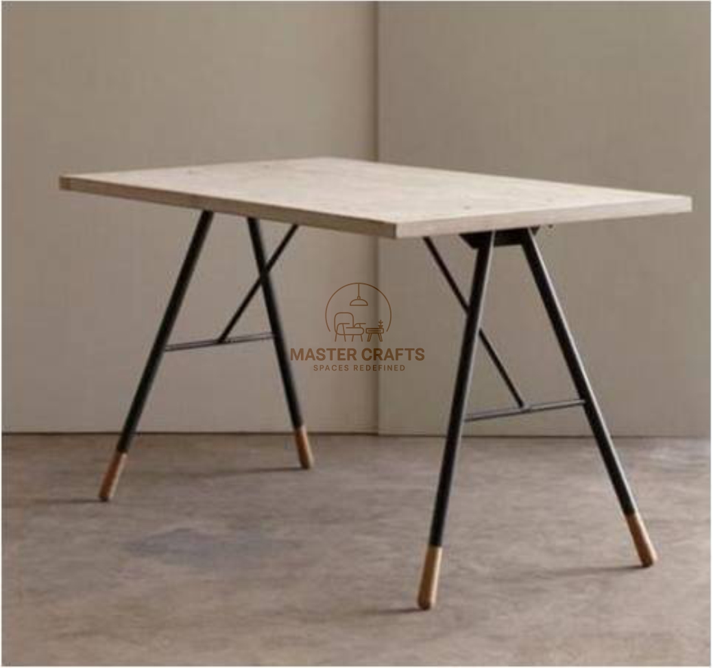 A light and airy table featuring a pale, natural wood or light composite rectangular top. It is supported by two slender, angled A-frame legs made of matte black metal rods that cross for stability. The charming detail is the small brass or light wood caps on the feet, adding a subtle touch of warmth and modernity. This Scandinavian-inspired trestle table is excellent for compact dining areas, creative workstations, or as a stylish craft desk.