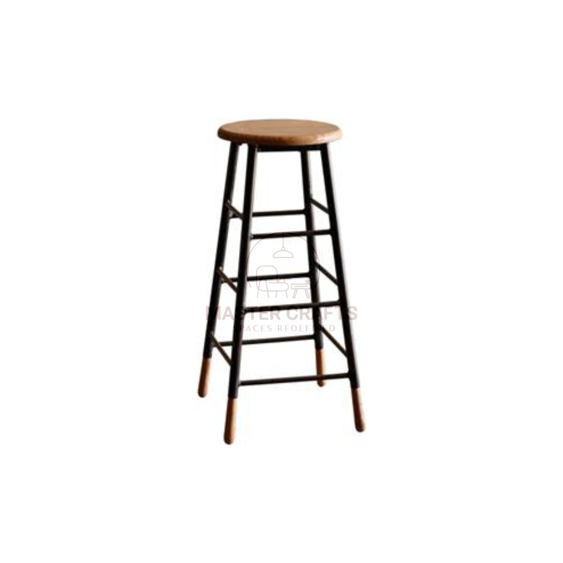 This highly durable stool offers a charming traditional pub look with a modern accent. It features a simple, round natural wood seat and a remarkably sturdy frame constructed from black-finished metal rods. The classic, durable spindle design is updated with multiple connecting rungs, which serve as comfortable footrests and ensure ultimate stability.