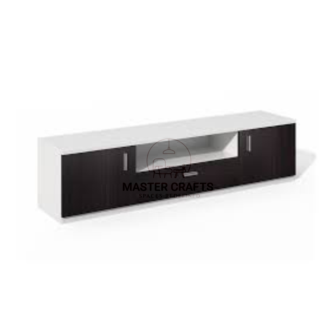 Maximize your floor space and achieve a seamless, contemporary look with this two-tone floating media console. The bold contrast between the crisp white top and sides and the dark espresso-finished cabinet fronts creates a striking visual appeal. Its long, horizontal form is designed to be wall-mounted, giving your living area an open and airy feel. It features a central open shelf for media players and two closed storage cabinets, perfect for discretely tucking away movies, games, and remotes. This console is the epitome of sleek, functional, and modern design.