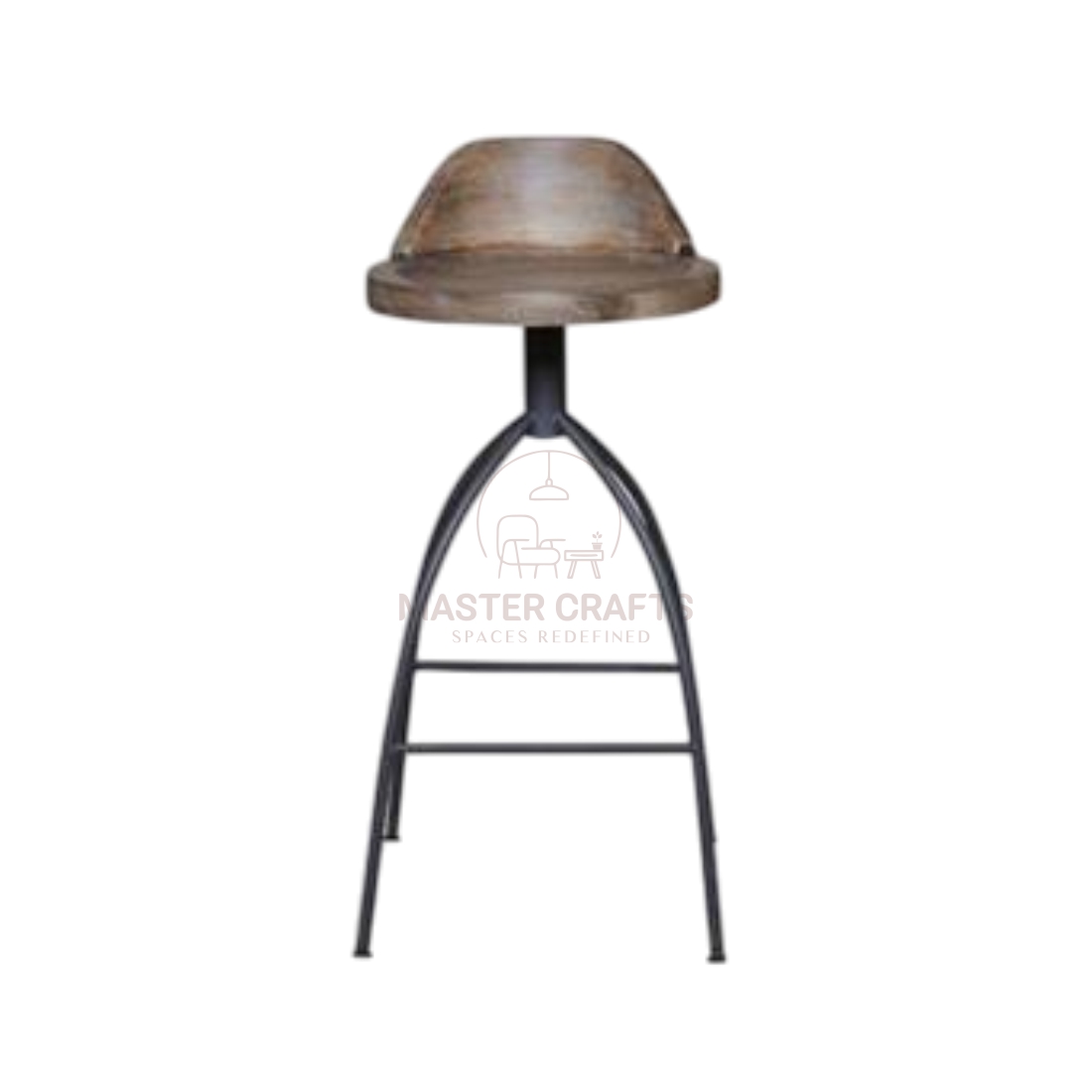 This is a stylish and comfortable stool that embodies a Mid-Century Modern influence. It features a generously padded, scooped bucket seat and a supportive mid-height back, all upholstered in a textured dark grey or black fabric. This ergonomic seat is supported by four sleek, tapered wooden legs in a rich, dark walnut finish, angled outward in a classic Mid-Century style. The legs are reinforced by metal cross-bracing, including a circular footrest, which is finished in a polished gold or brass tone. The combination of plush upholstery, dark wood, and metallic accents creates an elegant, luxurious, and highly comfortable seating option for sophisticated dining or bar areas.