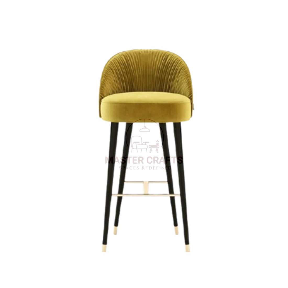 A stunning example of Art Deco and Hollywood Regency design, this Bar Stool is pure visual luxury. The seat is sumptuously upholstered in a vibrant mustard yellow or gold velvet, with the backrest featuring a distinctive vertical ribbed or pleated texture that adds incredible tactile and visual depth. The legs are slender and tapered, finished in a contrasting matte black and capped with bright brass ferrules (feet tips), a hallmark of refined design.